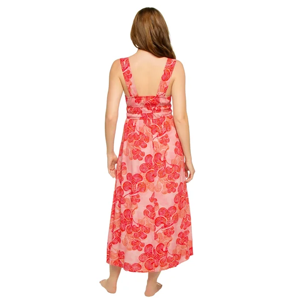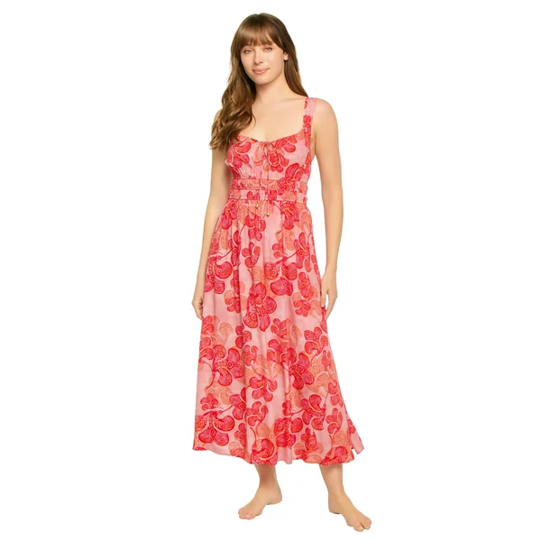 Floral midi dress features a keyhole neckline with tie adorned with gold cord ends, and offers smocking at the waist for a comfortable fit.