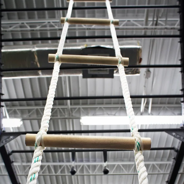 Rope Ladders have two large, 12″ loops at top and are joint-spliced below the bottom rung. First rung is about 18″ from floor (when hung at 12′, 15′ or 18′).