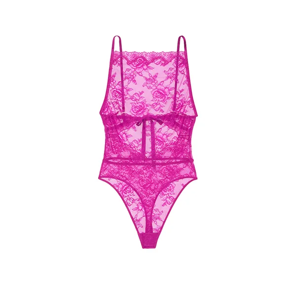 Our delicate and romantic rose-motif lace highlights the sophisticated silhouette of this sheer, high-neck bodysuit. It turns around to reveal a sexy cutout in back, topped with an adjustable bow.