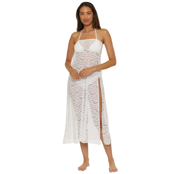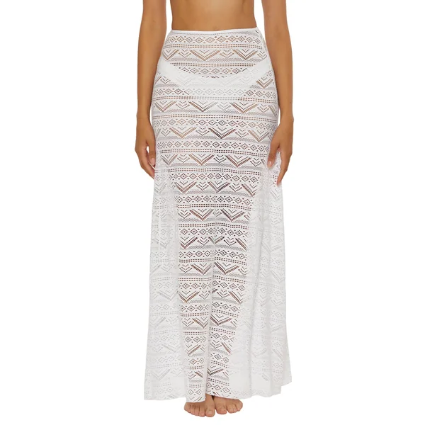 Rose maxi skirt features sheer crochet fabric. Offers an elastic waistband and side slits. Can be worn as a cover up skirt or a dress.