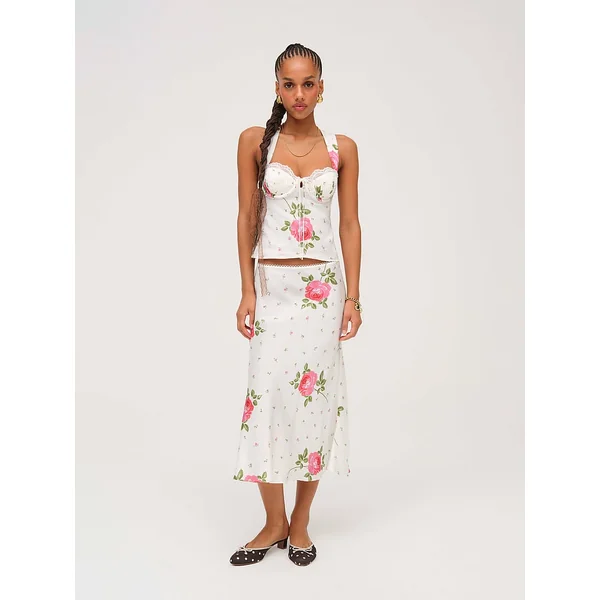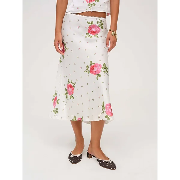 Adorned with a sweet allover floral print — exuding all things feminine. This floral Midi skirt sits at low waist, and is bias cut for a flattering fit.
