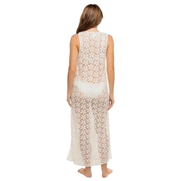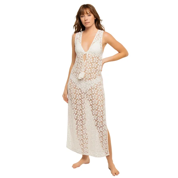 Rosemarie cover dress features delicate floral lace accented by charming tassel ends, a flattering v-neckline, and alluring thigh-high side slits.