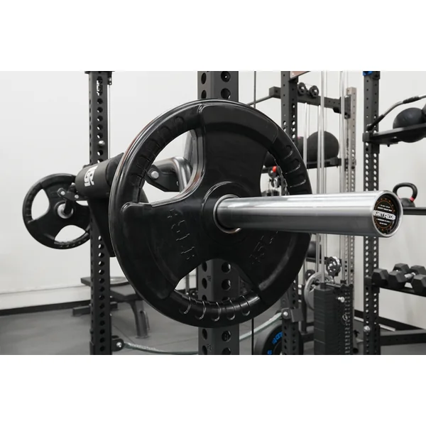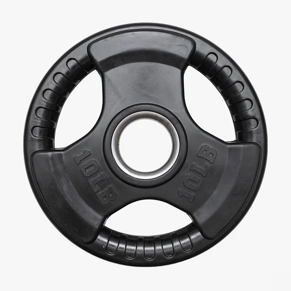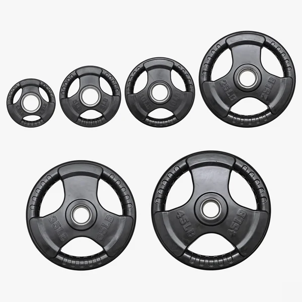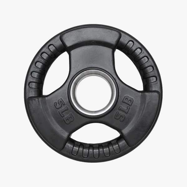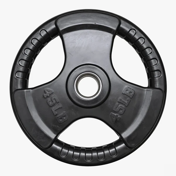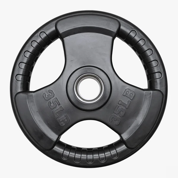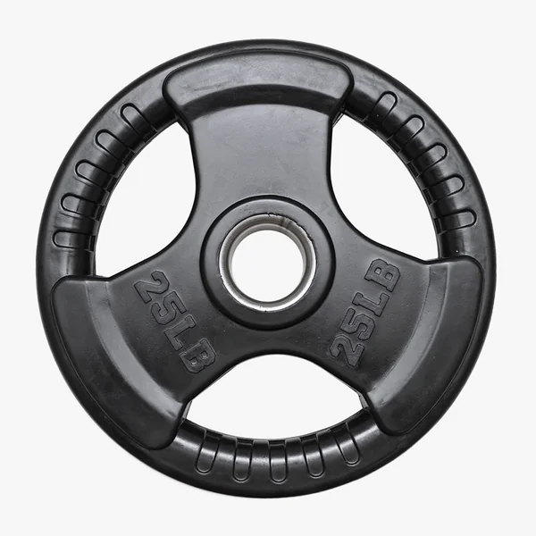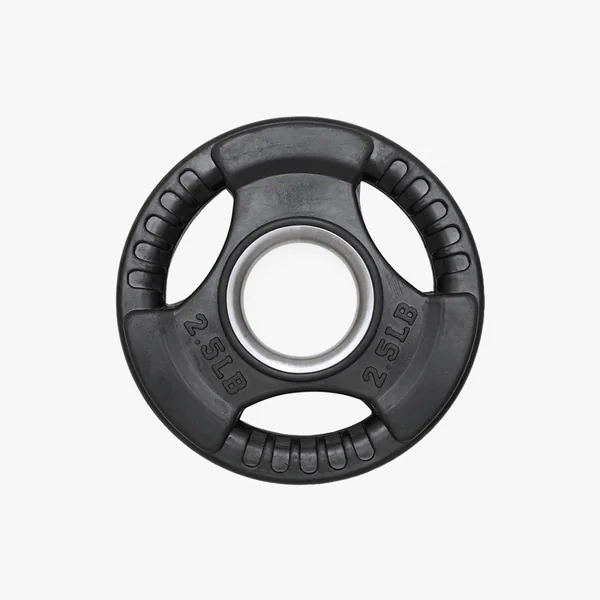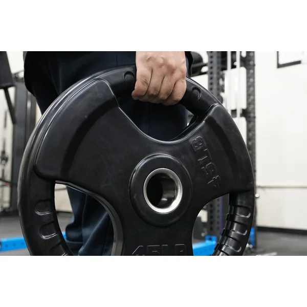 Ring diameter measures 2″ and fits standard Olympic barbells. Each plate features a smooth rubber coating secured by a metal insert, as well as three handles with a grooved texture designed to make gripping the plates easier. The raised lettering indicates each plate’s corresponding weight.