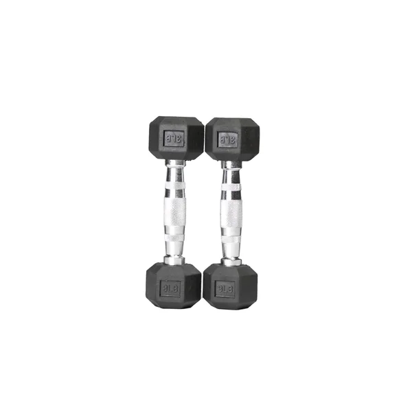Durability that simply can’t be matched. Wright rubber hex dumbbells resist cracking and fading while protecting floors and equipment. Made from solid cast iron with a 6-sided anti-roll design and encased in rubber, Wright dumbbells are extremely durable. The ergonomic handle (28mm to 34mm in diameter) fits nicely in your hands with a soft knurling for grip. Each handle is about 5.875″ long. (The 3 & 5lb handles are 23mm to 28mm and 5.25″ between heads.)