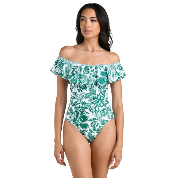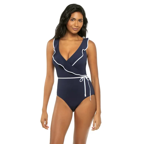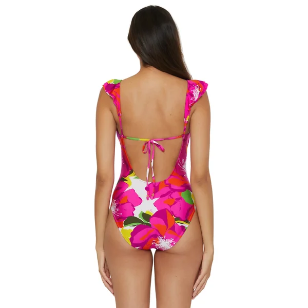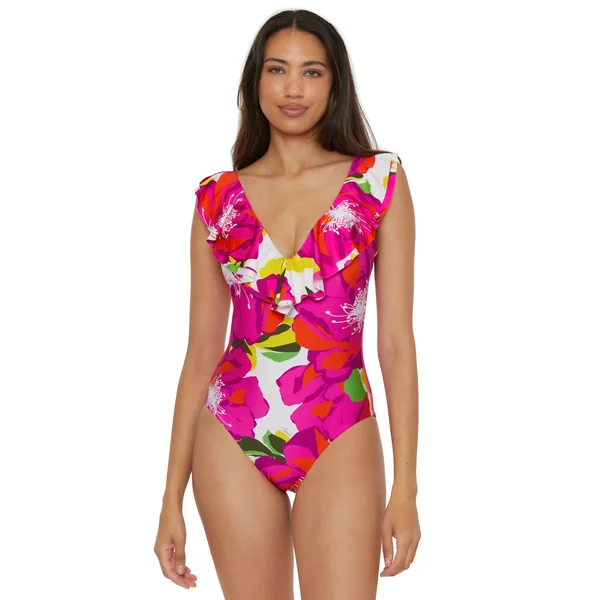 One piece swimsuit features floral print and a layered ruffle plunge neckline. Offers a shelf bra with removable soft cups, and full bottom coverage.
