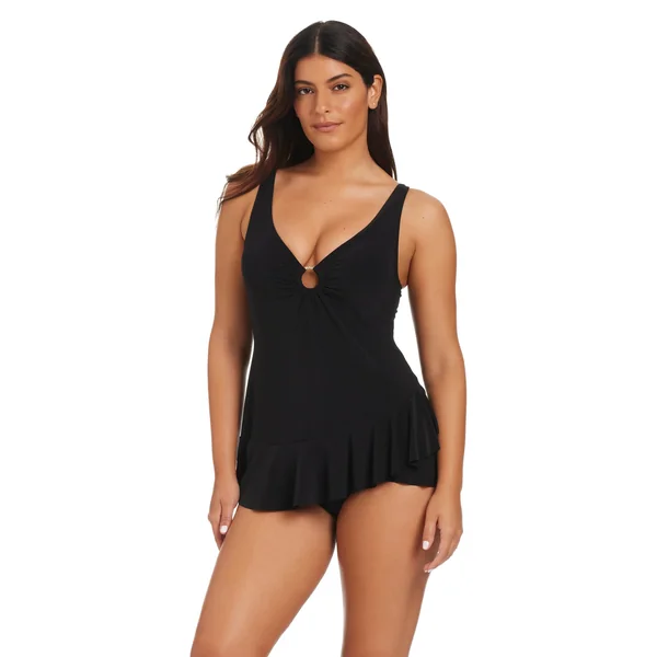 Swim dress features deep v-neckline, gold hammered center ring detail, and asymmetrical ruffle hem. Offers adjustable straps and moderate bottom coverage.
