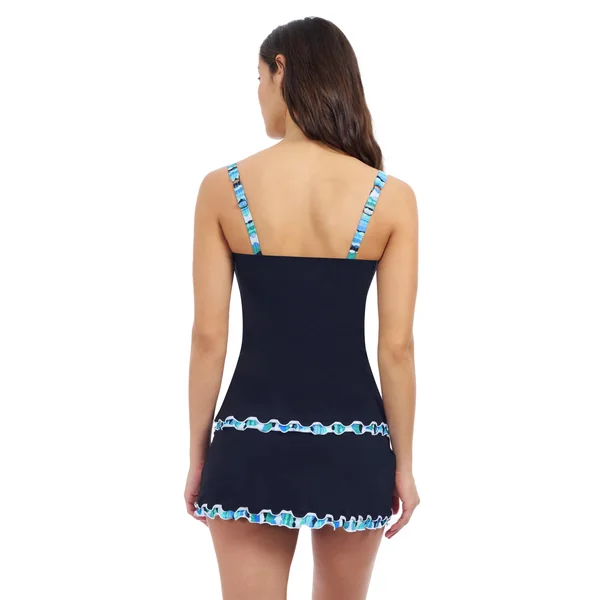 Tankini top features ruffled trim, offers built in bra, foam cups, and adjustable straps.