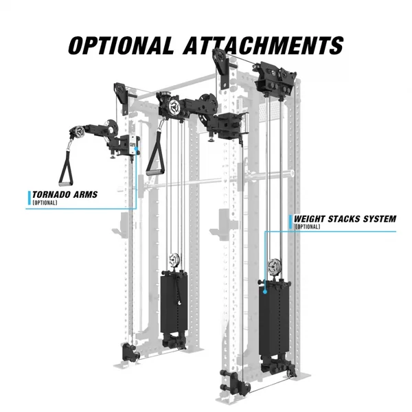 – The can be added to this rack at any time to have the perfect all-in-one training system that includes a half rack, smith machine, and functional trainer cable machine.