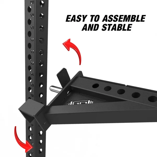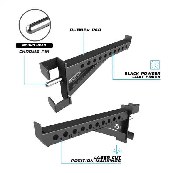 RX3 Spotter Arms attach to your upright and offer safety to you and your floor if you fail a lift. Spotter arms are there to catch your barbell if you ever need to dump the barbell on a failed lift. The spotter arms offer 25+” of area to dump your barbell. We’ve also added laser-cut holes and height markings along the spotter arm so that it can be used in conjunction with attachments like our .