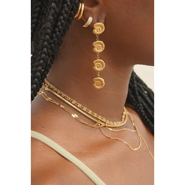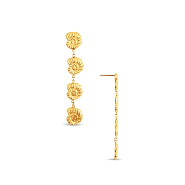 Sabrina shell drop earring features hypoallergenic gold plated stainless steel that is water resistant and offers a post closure.