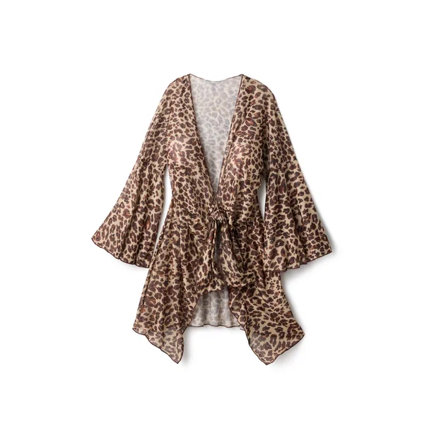 Kimono features animal print, three quarter sleeves, and a tie front closure.