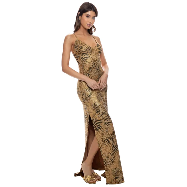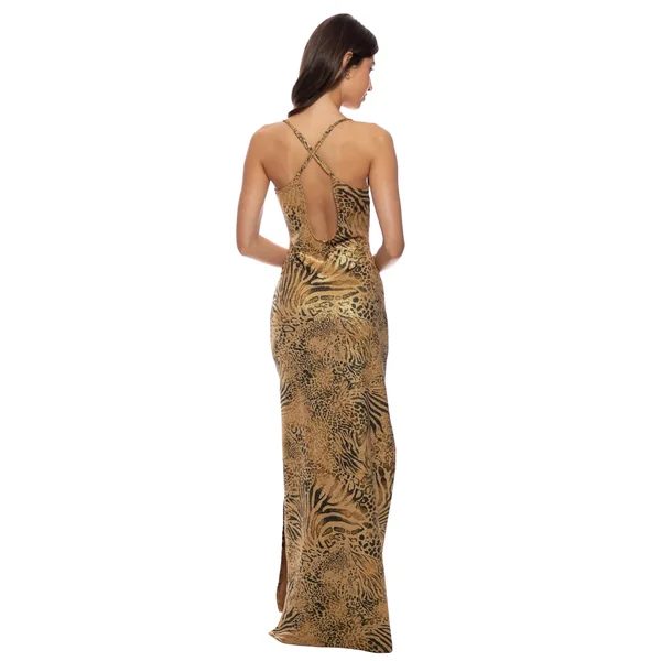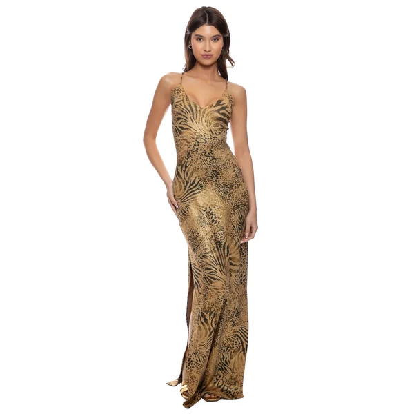 Textured maxi dress features metallic animal print fabric, a v-neckline, open back with cross straps and slits at each leg.