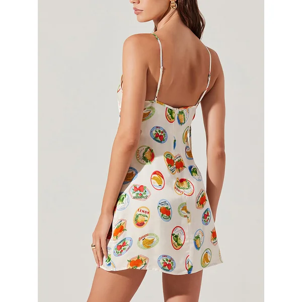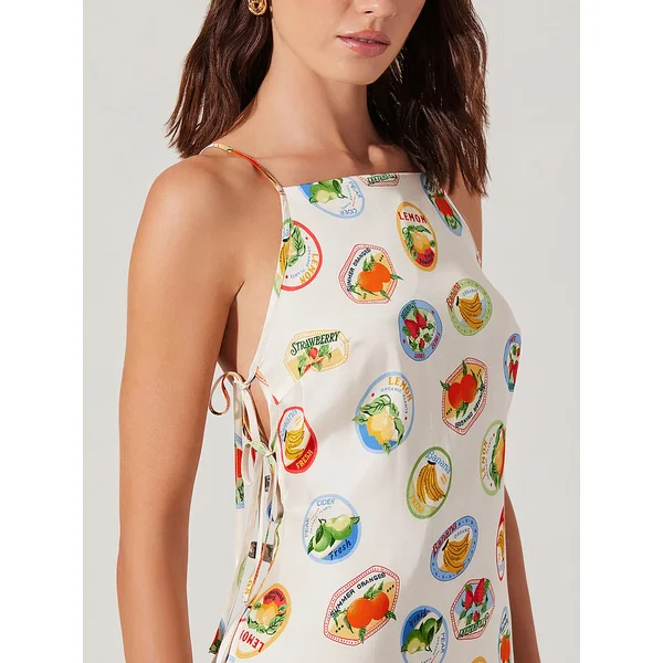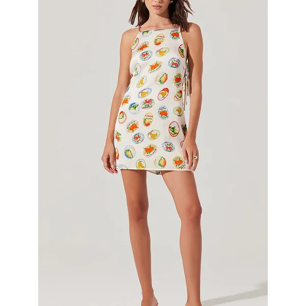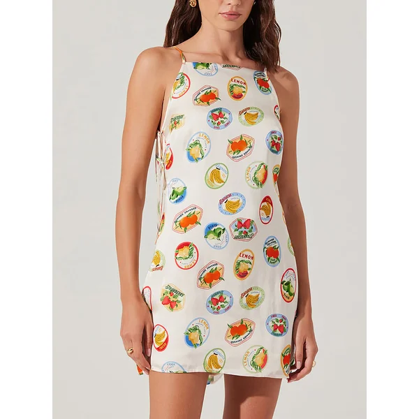 Summer’s top pick? This sweet, sheath mini Dress with side-tie details and fruity fresh finishes.