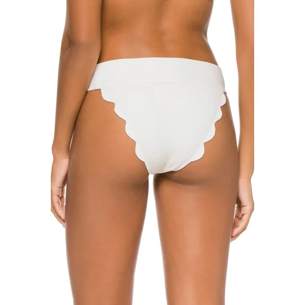 Banded hipster bottom featuring signature scallop detail with cross-hatched texture and raw edge for a seamless look. Offers moderate back coverage. Marysia pieces are made from premium Italian stretch fabric and cut by hand in a couture factory to ensure luxurious fit and quality.
