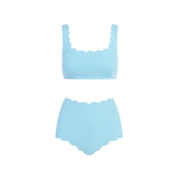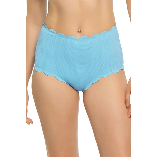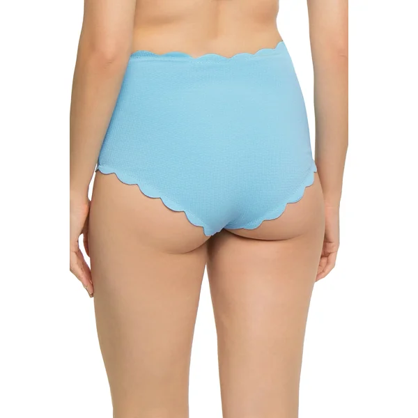 Bikini bottom features textured fabric, scalloped edges, and offers moderate coverage.