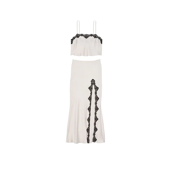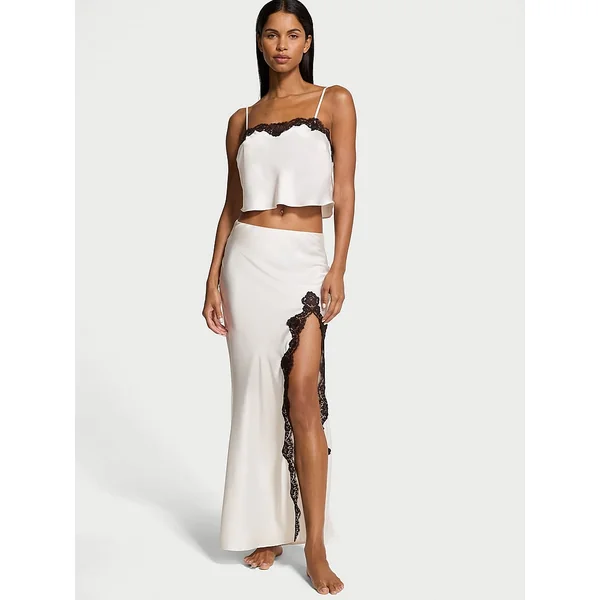 Going somewhere? Slip into something a little more iconic with this two-piece statement style. Crafted in silky satin with contrasting lace, the Cami Top features a cropped silhouette and the streamlined Skirt showcases a thigh-high slit.