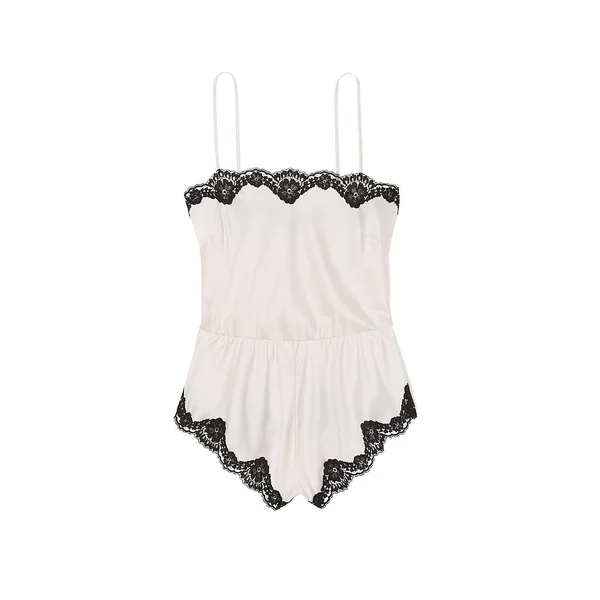 Silky satin and delicate lace give this one-piece a luxurious feel while gentle flutters at the legs add flirty movement.