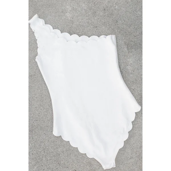 Santa Barbara one shoulder one piece swimsuit features a scalloped trim and textured fabrication. Marysia pieces are made from premium Italian stretch fabric and cut by hand in a couture factory to ensure luxurious fit and quality.