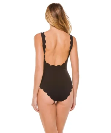 One piece swimsuit features a scoop neckline, shirred bodice, hardware details with cutouts at the sides, and full bottom coverage.