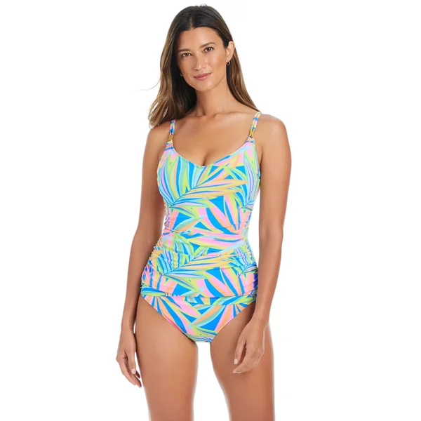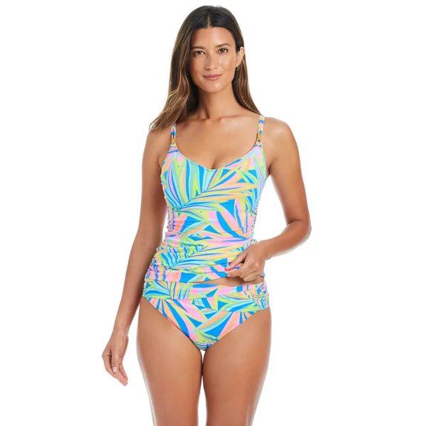 Tankini top features a scoop neckline, floating underwire, shirred bodice and adjustable shoulder straps.