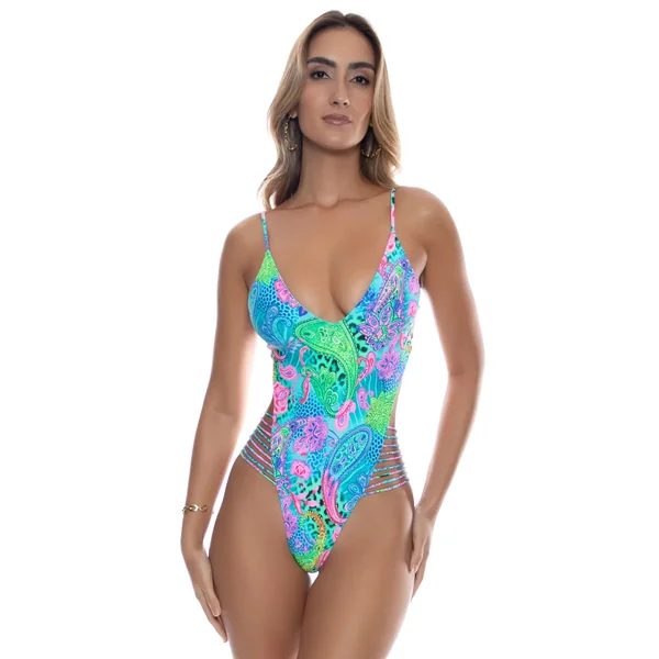 One piece swimsuit features mixed animal and floral print, plunge neckline and high leg cut with strappy details. Offers adjustable straps and minimal bottom coverage.