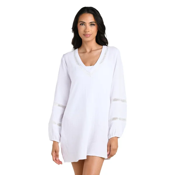 Tunic features a v-neckline with embellished trim and long balloon sleeves accented with matching decorative bands.