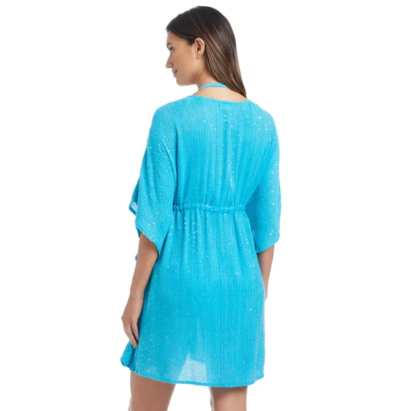 Caftan features sequin details, a plunging neckline, butterfly sleeves, and a drawstring tie waist.