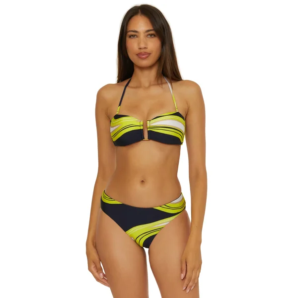 Bikini top features neon print, a gold plated u-ring detail. Offers removable soft cups, a removable halter strap, and a tie back closure.