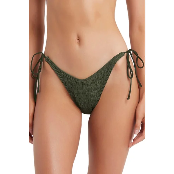 Serenity brazilian bikini bottom features crinkle stretch fabric and side ring details. Offers adjustable ties at hips and minimal coverage.