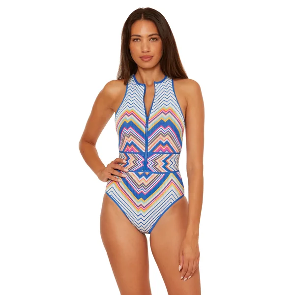 Textured one piece swimsuit features zig-zag striped print, high zipper neckline and racer back with key hole. Offers removable soft cups, underbust elastic for support, and moderate bottom coverage.