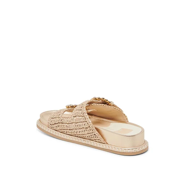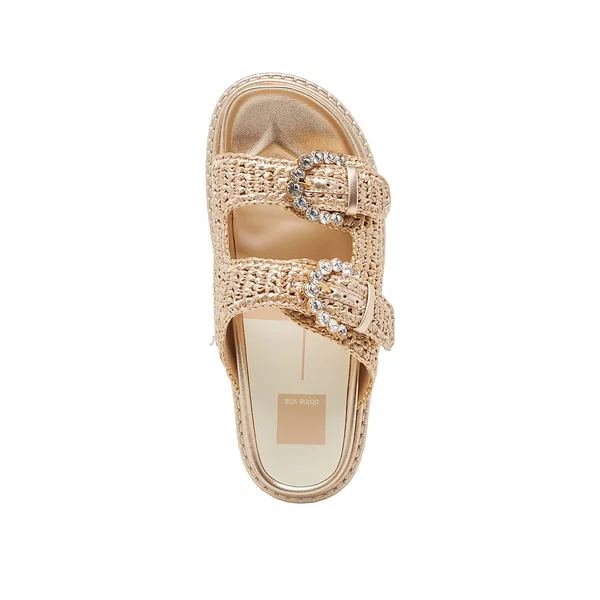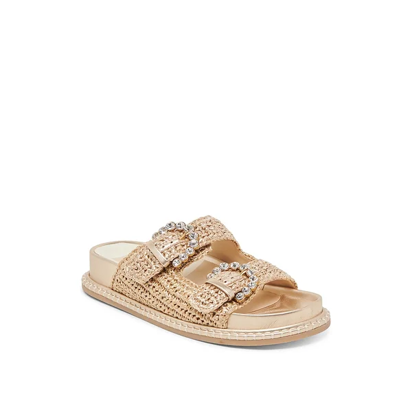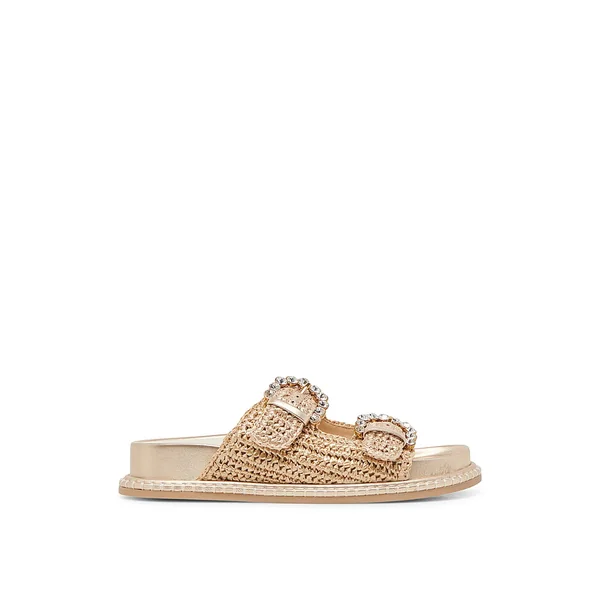 Add a beachy touch to a simple style in these sandals. Crystal-decorated buckles bring elegant to the simple silhouette, crafted with a summery raffia upper.