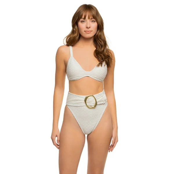 Shay textured bikini top offers adjustable straps and a hook back closure.