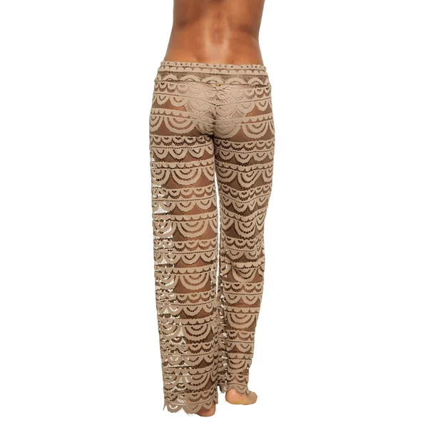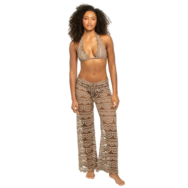 Sheer crochet cover pants with drawstring waist and scalloped hem.