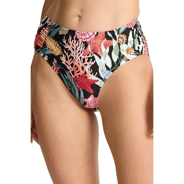 Textured bikini bottom features eye-catching shell print, a high waistband, shirred sides and moderate coverage.