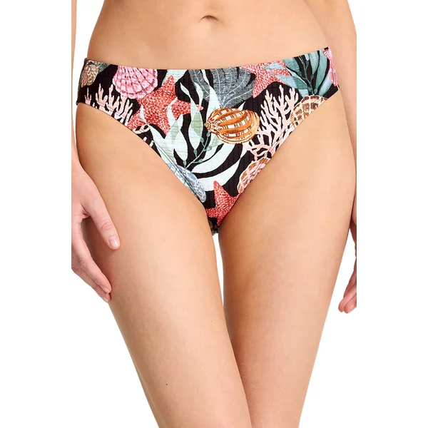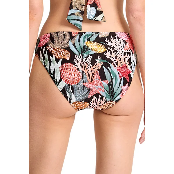 Textured bikini bottom features a classic silhouette and eye-catching shell print. Offers moderate coverage.