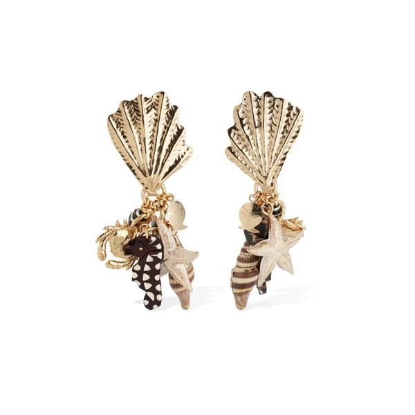 Earrings feature gold-plating hammered in the shape of a shell, adorned with marine charms: crab, starfish, seahorse, fish and shellfish. Offers a post back closure.