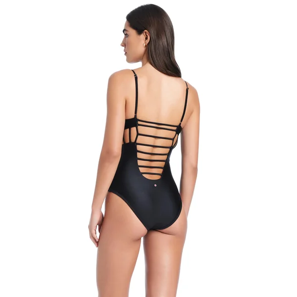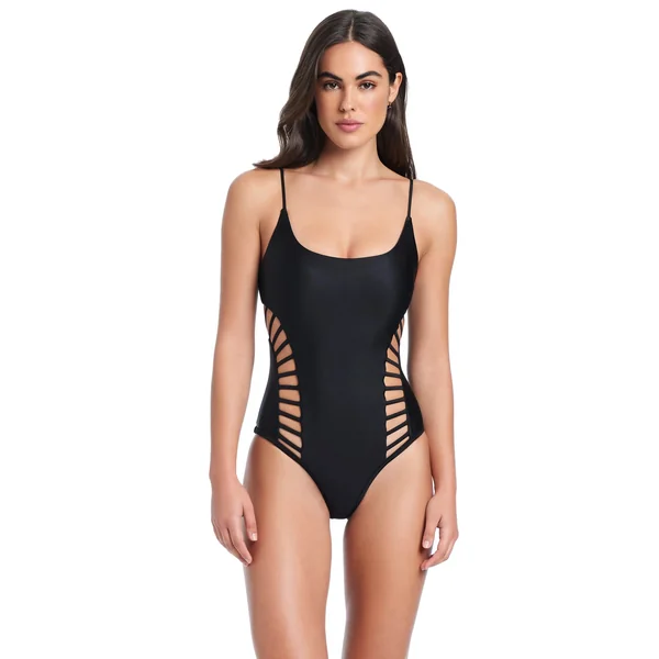 One piece swimsuit features shimmer fabric, ladder-style cut-outs and a strappy back. Offers adjustable straps and moderate bottom coverage.