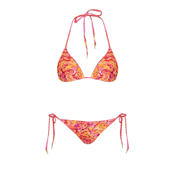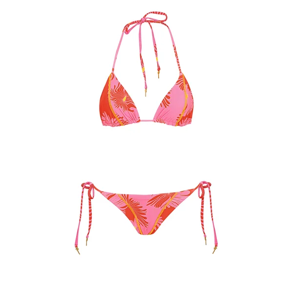 Brazilian bikini bottom features a reversible print. Offers adjustable ties adorned with gold-plated rings and minimal coverage.