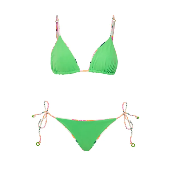 Brazilian bikini bottom reverses from floral print to a vibrant solid green. Features adjustable braided tie sides and minimal bottom coverage.