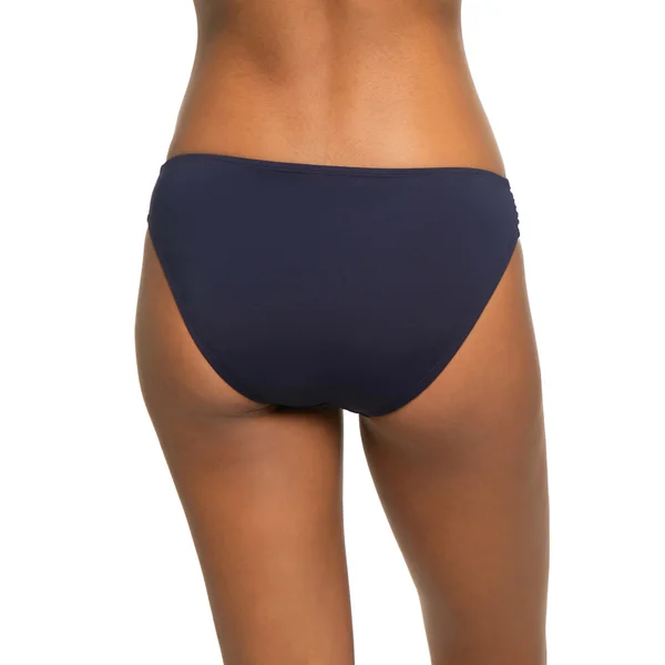 Bikini bottom features a classic silhouette with shirred sides and offers moderate coverage.