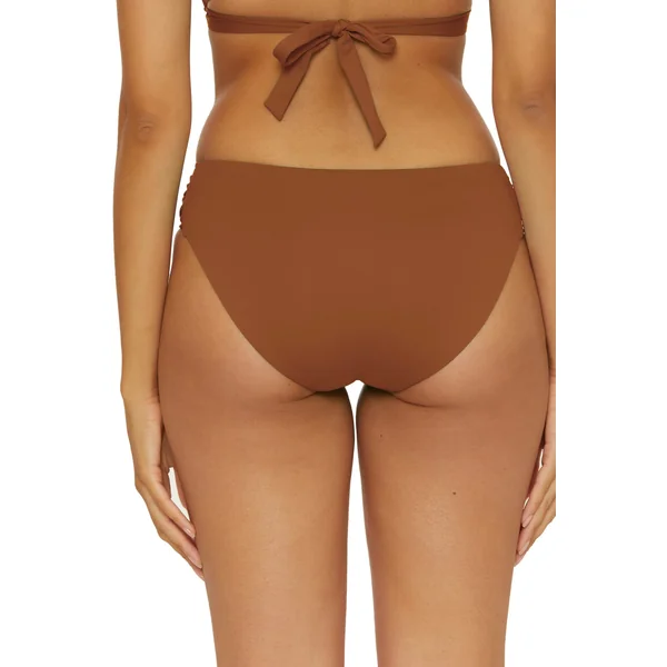 Hipster bikini bottom features shirred tab side detail and offers moderate bottom coverage.