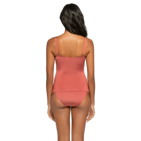 Tankini top features a cross over v-neckline, tortoise chain details on the straps and a shirred bodice. Offers tummy control, removable soft cups, and adjustable straps.