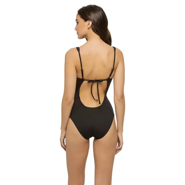 Show & Tell one piece swimsuit features a plunge neckline, textured ribs, and diagonal inset seaming. Offers adjustable straps, tie back, removable cups, and moderate coverage.