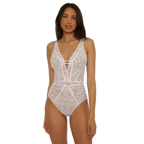 Show & Tell one piece swimsuit features a plunging neckline with ladder accent, sheer crochet insets with binding, diagonal inset seaming, and removable soft cups. Offers an open back with adjustable shoulder straps, back ties, and moderate coverage.