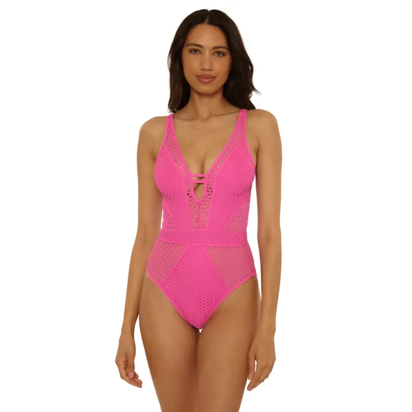 Show & Tell one piece swimsuit features a plunging neckline with ladder tabs, fishnet crochet overlay and insets with binding, diagonal inset seaming and removable soft cups. Offers an open back with adjustable shoulder straps, back ties, and moderate coverage.