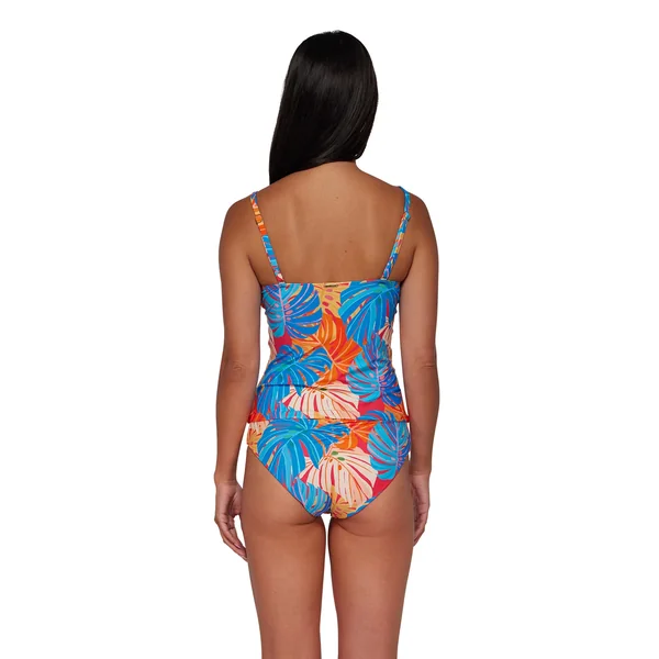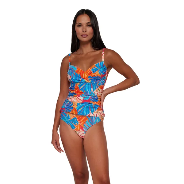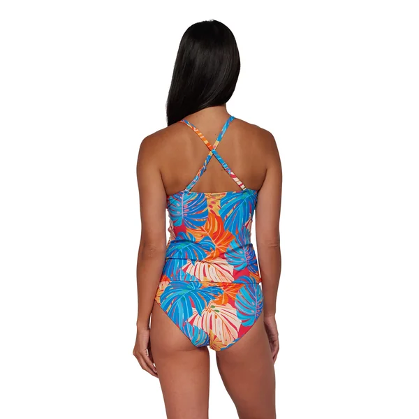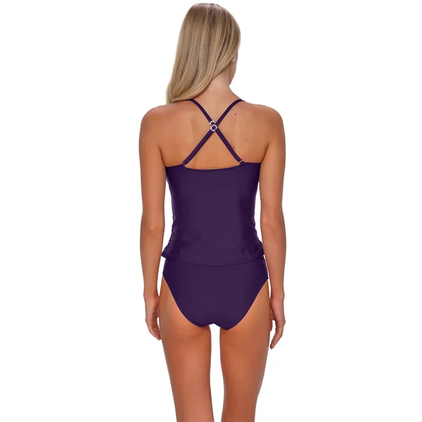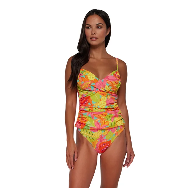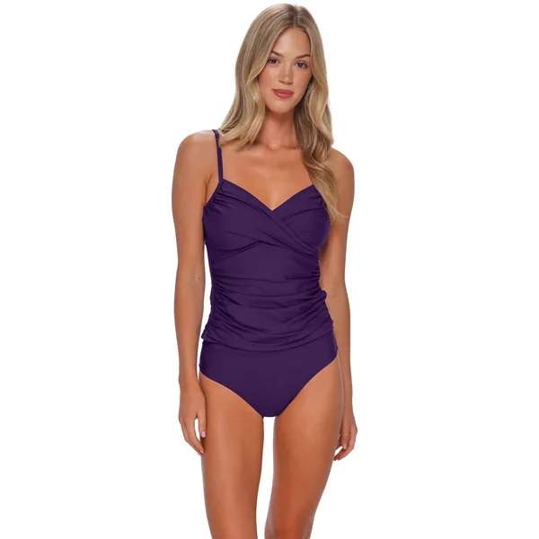 Simone tankini features shirring along the sides and a flattering crossover neckline. Offers removable cups and adjustable straps that can be converted to a crossback.