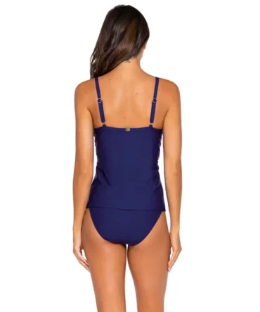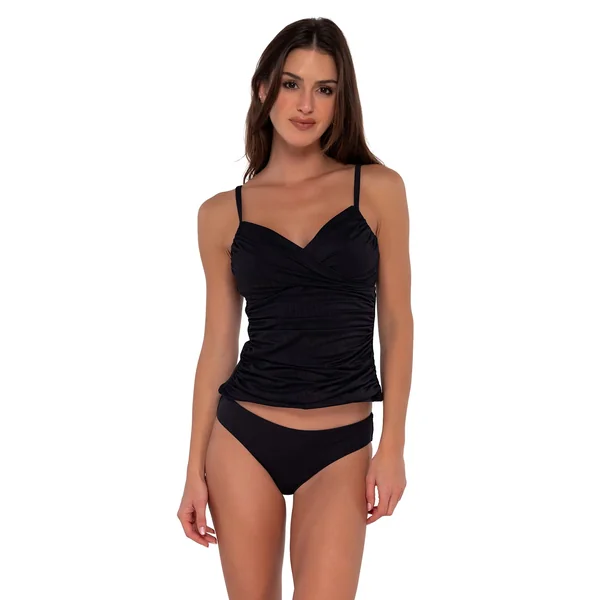 The Simone tankini is sleek and sophisticated. With shirring along the sides and a flattering crossover neckline, this tankini is a summer staple. Features include over the shoulder adjustable straps that can be converted to a crossback, removable cups, and matching colored lining.