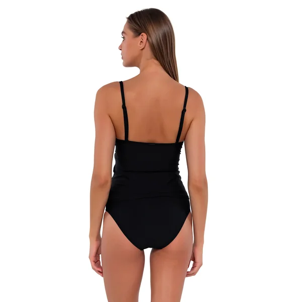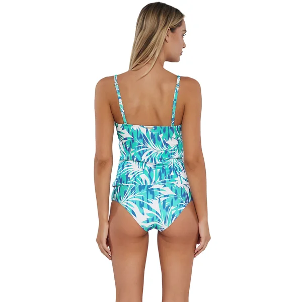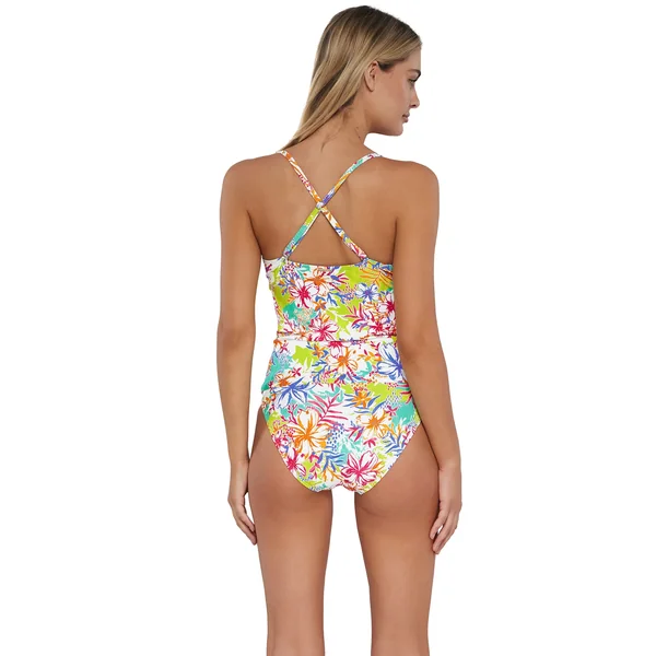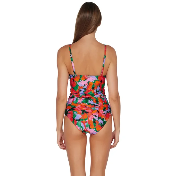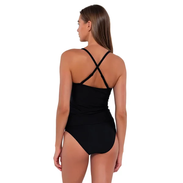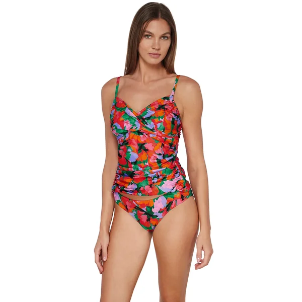 Simone tankini features shirring along the sides and a flattering crossover neckline. Offers removable cups and adjustable straps that can be converted to a crossback.