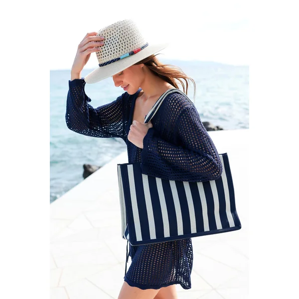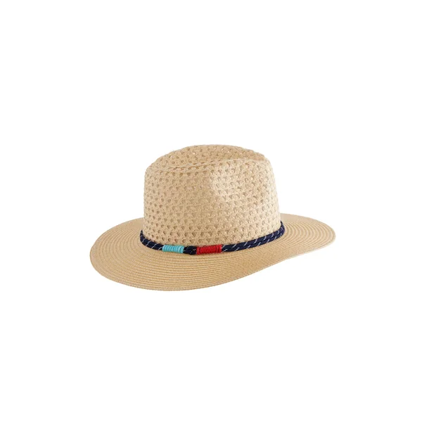 Skylar hat features an open weave design crafted from natural straw, accented with a nautical-inspired band in navy, red, and aqua. A wide brim offers stylish protection from the sun.