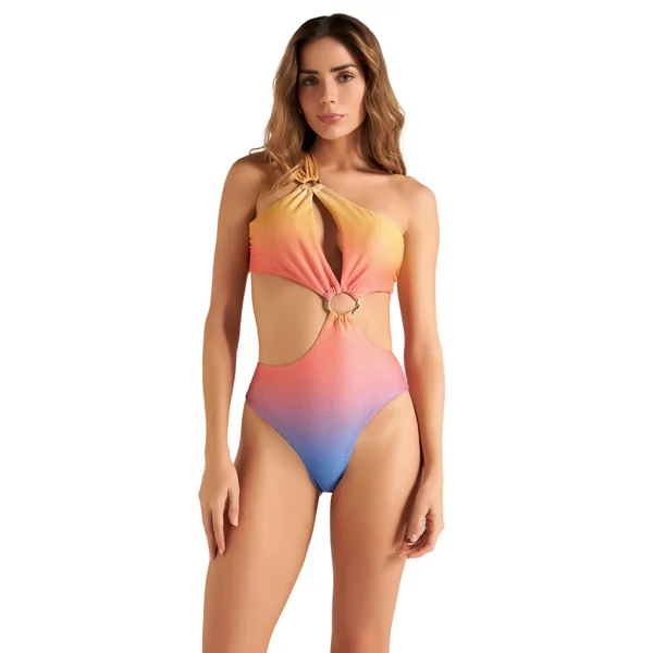 Skyline one piece swimsuit features an asymmetrical neckline with elegant ring hardware details and chic cutouts. It offers a back tie closure for adjustable comfort and moderate coverage.